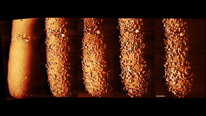 他们观察的是大肠杆菌,用的是能看到纳米级细节的显微镜,就是那种连细菌表面一点点变化都能抓着的设备。